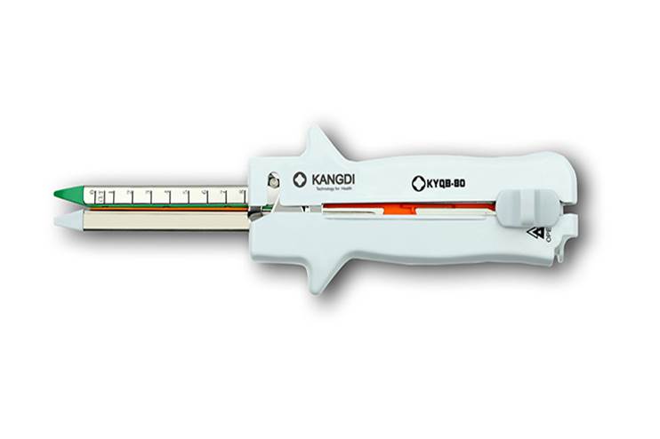 一次性使用直線型切割吻合器提供左右各兩排交錯(cuò)的鈦釘,可同時(shí)閉合并切割兩組鈦釘之間的組織。
